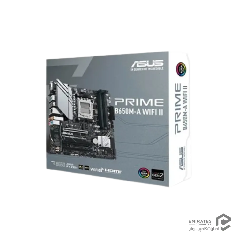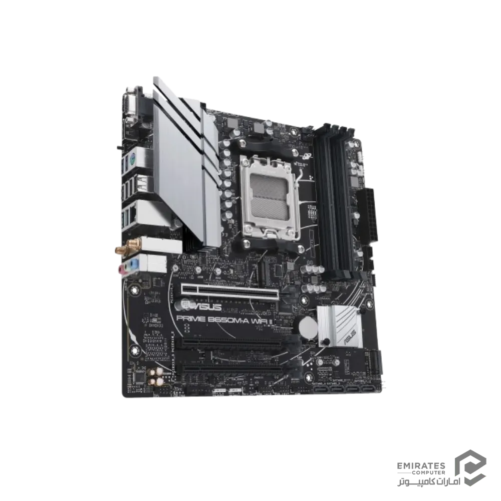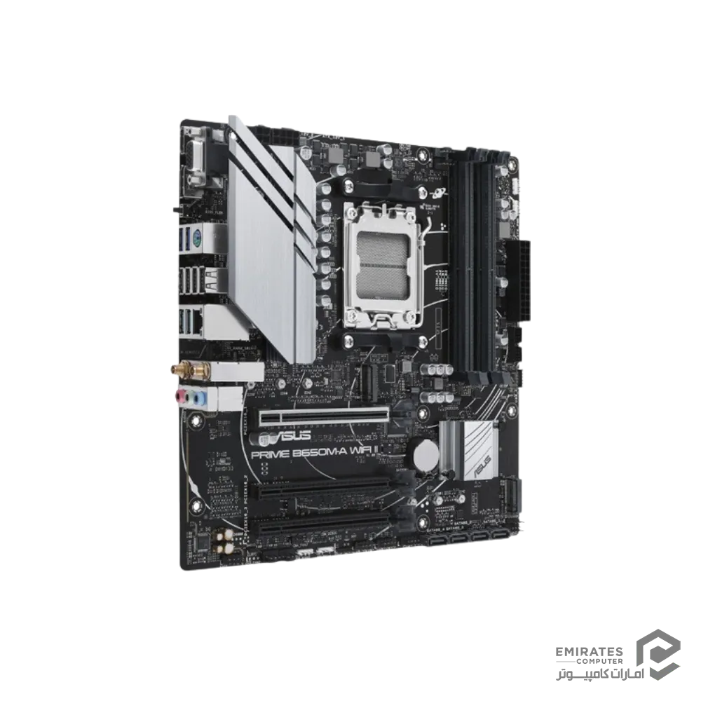 مادربرد ایسوس ASUS PRIME B650M-A WIFI II با چیپست AMD B650 طراحی شده و از پردازندههای جدید سری Ryzen 7000 روی سوکت AM5 پشتیبانی میکند؛ یعنی همان جایی که ایسوس دستبهکار شده تا برای همه—from کاربران عادی تا حرفهایهای بازار گیم و ادیت—یک پلتفرم قوی و مقرونبهصرفه بسازد. آنچه PRIME B650M-A WIFI II را متمایز میکند، ترکیب هوشمندانه امکانات نسل جدید مثل PCIe 5.0، DDR5، Wi-Fi 6، VRM قدرتمند، پورتهای متعدد USB و ظاهر مینیمال اما شیک است که آن را برای انواع کیسهای گیمینگ و اداری جذاب میکند.